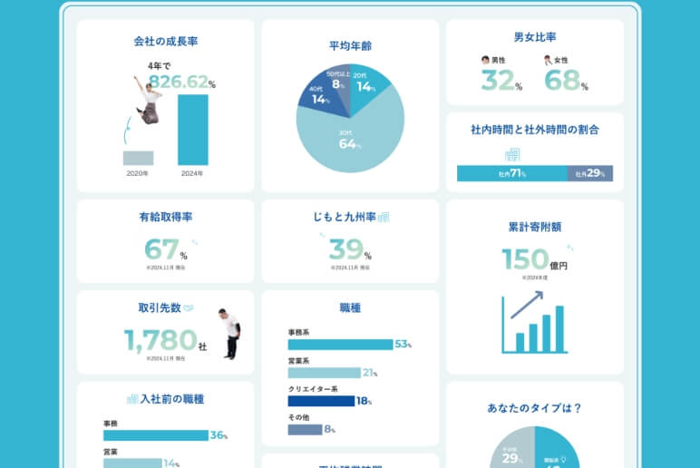 数字や図を使用して、会社について紹介するコンテンツ。求職者が気になる、残業時間や有給取得率などで働きやすさをアピール!